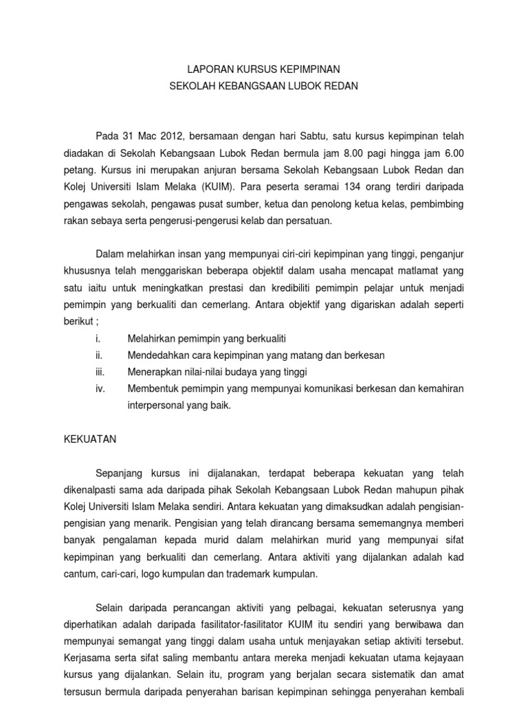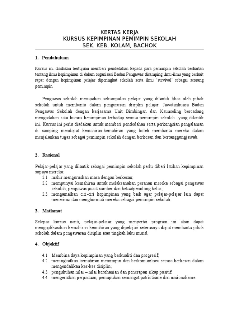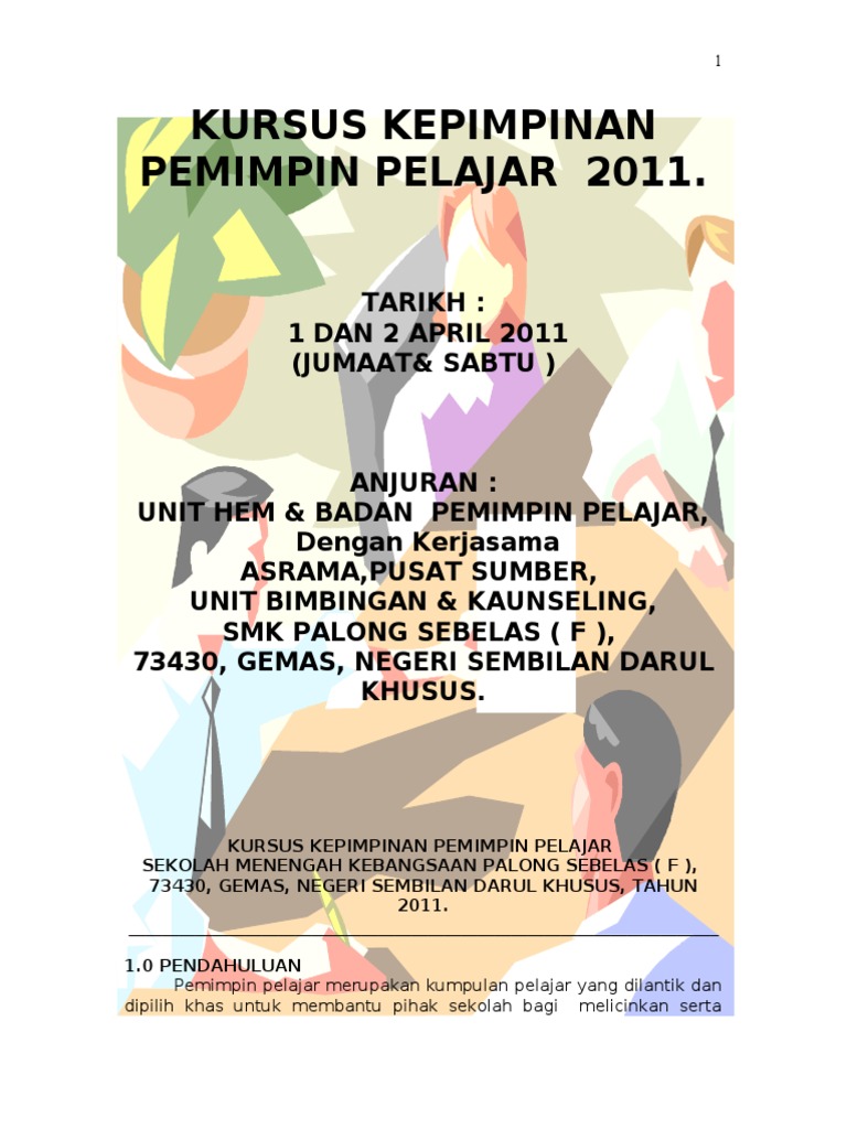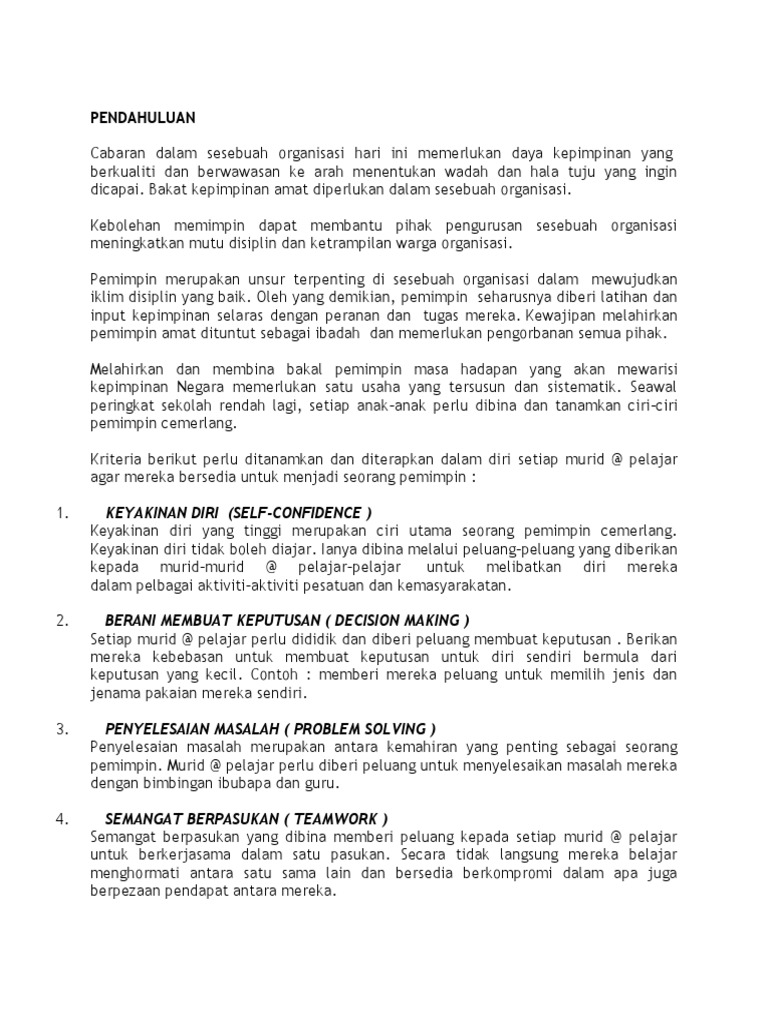 Kursus kepimpinan pengerusi dan setiausaha kelab, persatuan dan unit beruniform. Menjadi seorang murid yang berkualiti adalah impian setiap pelajar. Jika pengertian pemimpin adalah manusia atau pelakunya, maka kepemimpinan adalah cara atau sifat dari pelaku. Sebagai pepimpin yang berkapatitas, pemimpin dalam kepemimpinan kristen juga harus memiliki karakter kristen sejati. Misalnya memiliki kharisma, pandangan kedepan, serta daya persuasi dan intesitas. Pemimpin (atau ketua jabatan) secara bersendirian mesti mendapatkan kerjasama. Yang terpenting bukan siapa yang menjadi pemimpin tetapi apa yang dihasilkan oleh seorang pemimpin. Pemimpin pelajar yang berketrampilan dan berwibawa. 1) kepemimpinan yang jujur, membela kebenaran, dan. Sebagai seorang pemimpin yang baik seharusnya membantu dan membimbing pengikutnya agar bisa mencapai tujuan. Pemimpin yang baik adalah orang yang belajar dari kesalahan, dan tidak pernah berhenti untuk mempelajari hal yang baru berada di sekitarnya. Hal ini kerana pelajar yang berkualiti akan menjadi kebanggaan ibu bapa, guru dan pihak sekolah. Sering terjadinya pergantian kabinet masa demokrasi liberal yang menyebabkan program yang dirancang oleh kabinet tidak bsa.